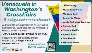 Task Force on the Americas will hit the ground running in 2026. We are organizing an emergency series of webinars in conjunction with Helena Cobban and Just World Education. The webinar series, Venezuela in Washington’s Crosshairs: Breaking the Information Blockade, will begin next week – Tuesday, January 6 and Thursday, January 8, and will continue on Tuesday, January 13. See more info about the webinars below.